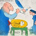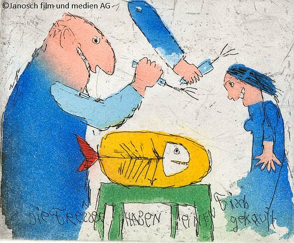 Janosch "Der Fisch wird gebraten" Radierung 35 x 35 cm