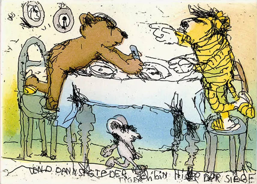 Janosch "Am Tisch" Handcolorierter Andruck 21 x 22 cm